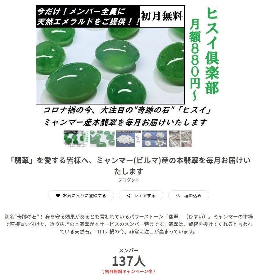 私たちは、CAMPFIREコミュニティで「ヒスイ倶楽部」というコミュニティサロンも運営しております。翡翠が毎月届くコミュニティです。