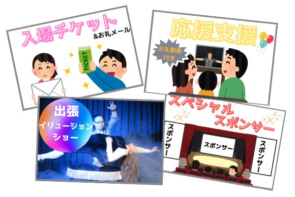 マジックシアターTRICKのオリジナルグッズや入場チケットを始め、ペアチケット、回数券、出張ショーの前売り、そしてショーのスポンサー権(ショータイム前の時間に御社のCM動画を大型ビジョンで放映、エンディングで御社商品や名前のマジシャンによる紹介)等を考えました。要望があれば随時リターンは増やしていこうと考えていますので何卒よろしくお願いいたします。