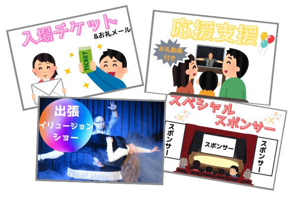マジックシアターTRICKのオリジナルグッズや入場チケットを始め、ペアチケット、回数券、出張ショーの前売り、そしてショーのスポンサー権(ショータイム前の時間に御社のCM動画を大型ビジョンで放映、エンディングで御社商品や名前のマジシャンによる紹介)等を考えました。要望があれば随時リターンは増やしていこうと考えていますので何卒よろしくお願いいたします。