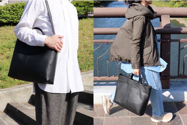 ほとんど使わない機能を増やす事より、毎日の使い勝手をとことん考えました。ハンドルの長さは、腕にはしっかりかけられるし、手で持った時にもバランスが良い長さ。肩かけベルトは、取付け取外しをしなくても、きちんと収まりが良いように取り付けてあるので、ささっと肩にかけられます。そして、金具は表に出ないようにしました。金具が見える事で洋服との相性が合わなかったりのストレスを無くすためです。
