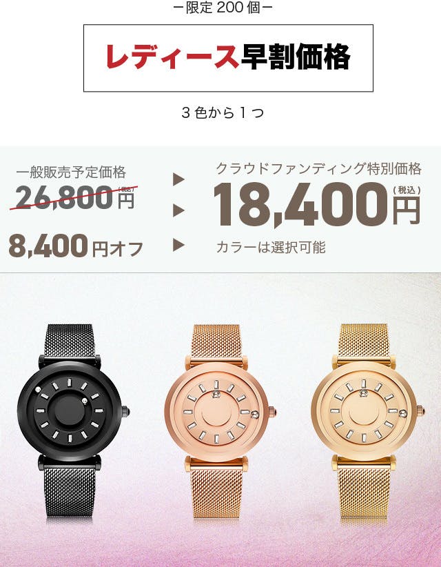前回たくさんの応援購入をいただいた「磁力で刻む腕時計」から、今回、ご要望にお応えしてレディースのみなさまにも手にとっていただける商品をメーカーさんに作っていただきました!