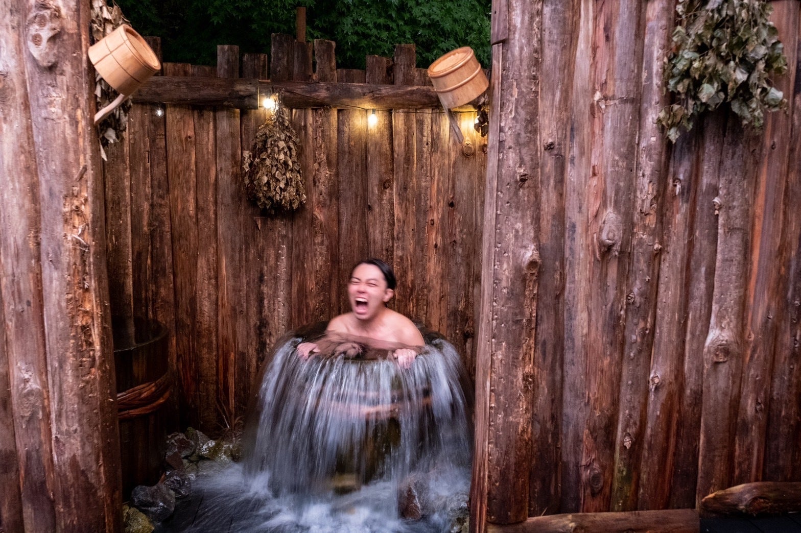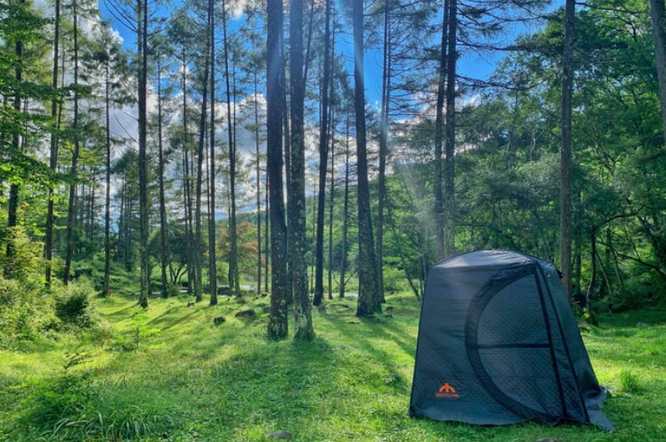 自然の中でアウトドアサウナ。セルフロウリュで滝汗。