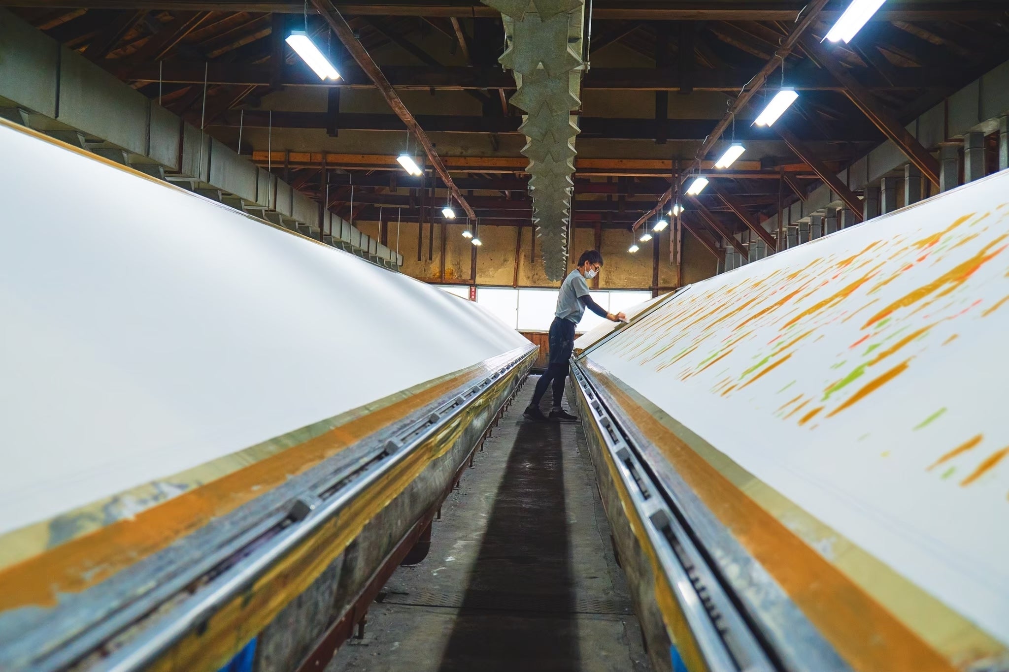 今回、このふろしきスカーフを制作するに当たって、数々の有名ブランドを手がける京都の馬場染工場とタッグを組みます。京都で100年以上続くこの工場は、職人さんが一枚一枚手作業で染め上げます。