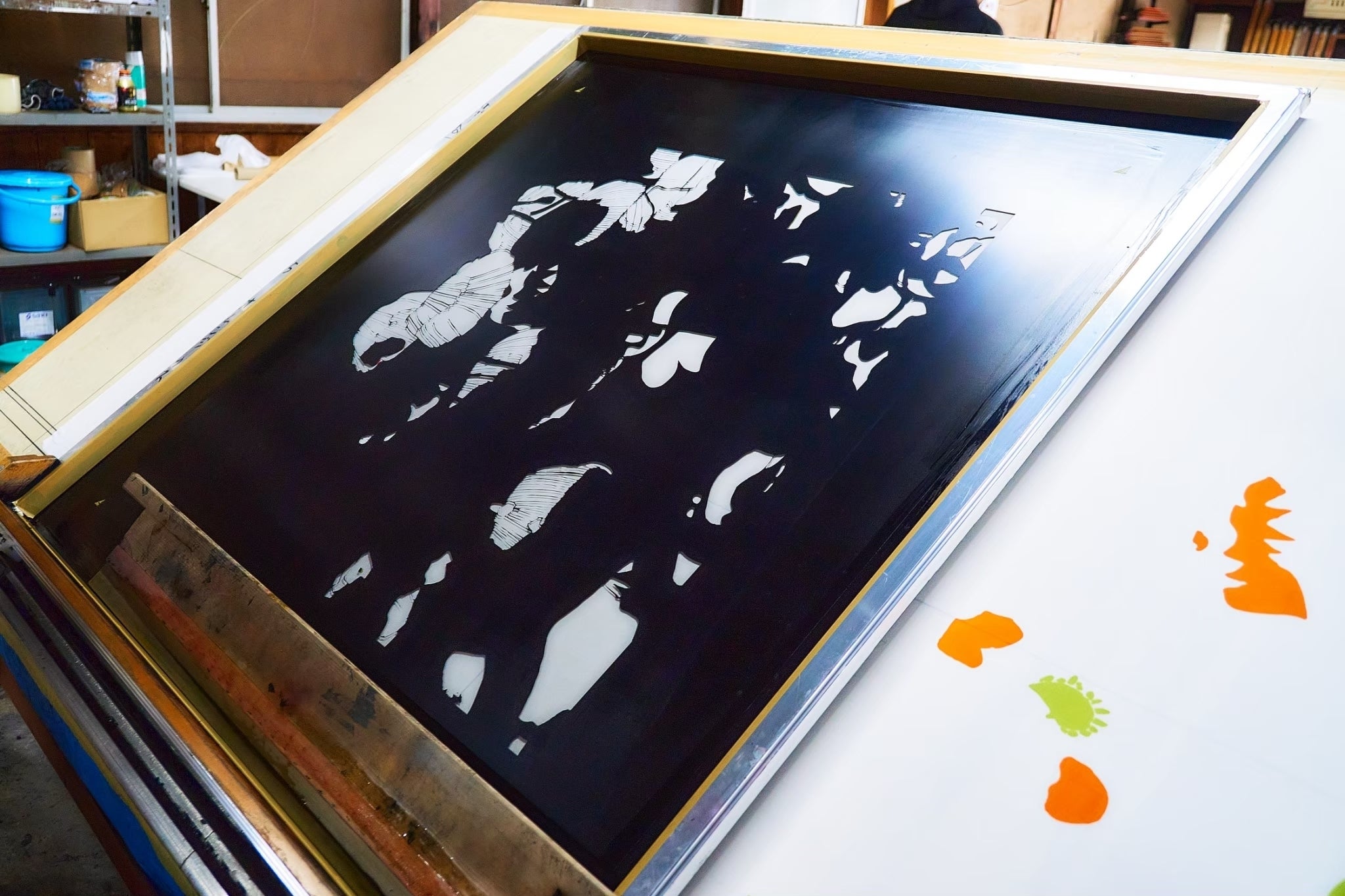 次に、こだわり抜いた生地は手染めで色鮮やかに変身します。一言で手染めと言っても、さまざまな行程があります。まずは、型の製作。一色ずつ異なる型を製作します。濃いオレンジを使う部分用の型、薄いオレンジを使う部分の型など・・・製作に2週間ほどかかります。次に、一色一色を手作業で作り出します。馬場染工場さんと何度もサンプル品を確認し、素の絵を生地の上で活かせる色合いにしました。