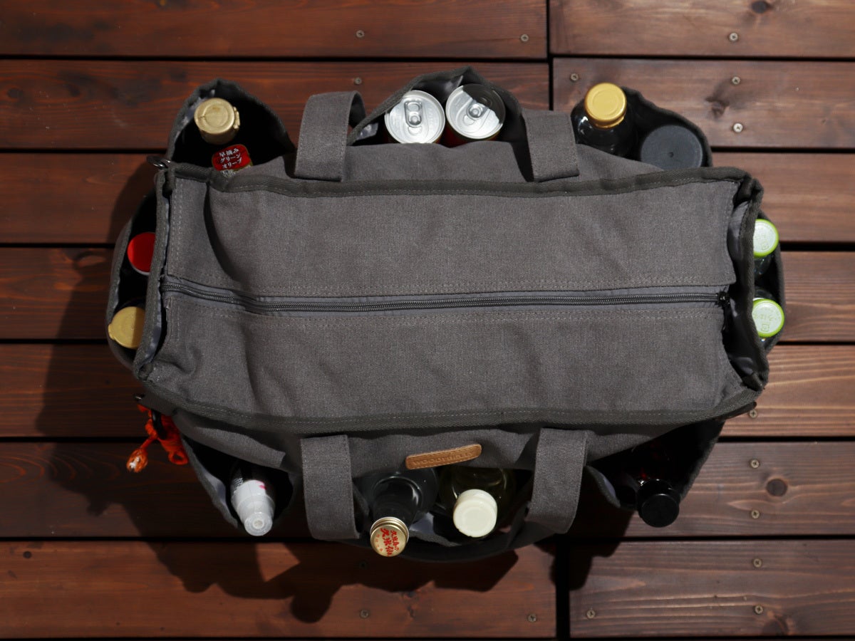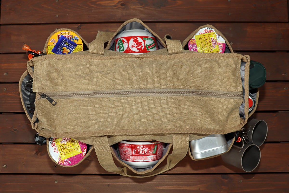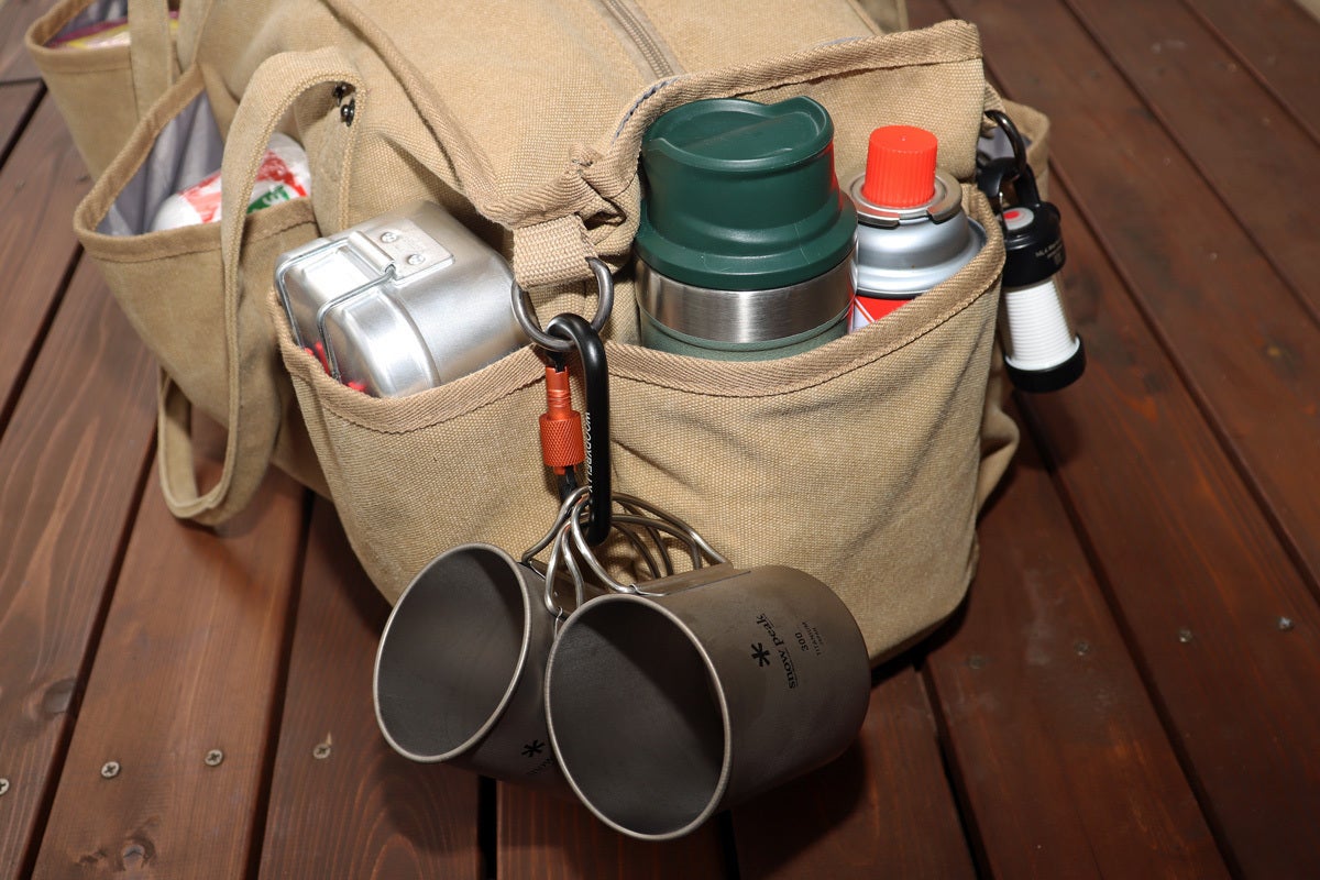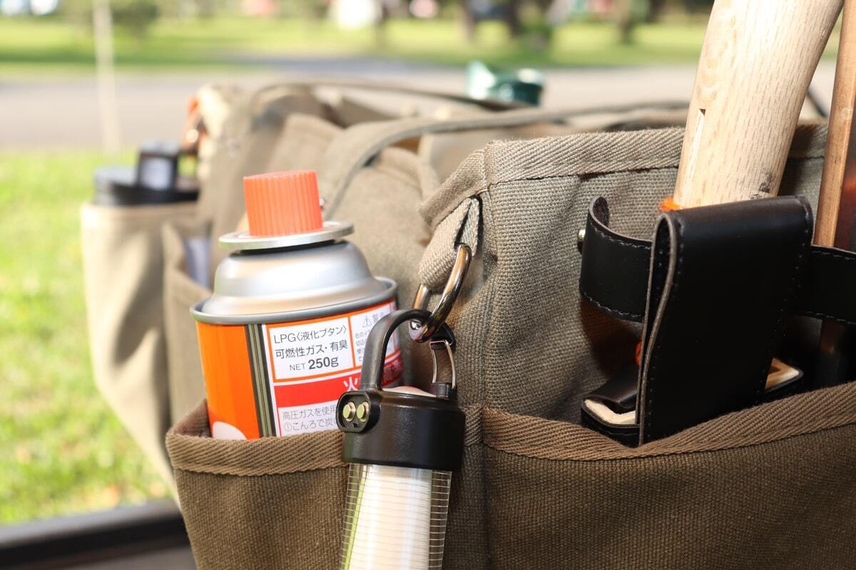 ただ収納力があるだけでなく、ガス缶や保温ボトル、シェラカップや焚火道具など持運びしにくい形状の道具をまとめて収納できるバッグなんです。