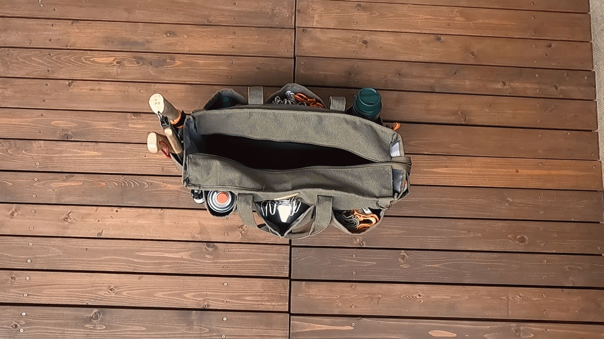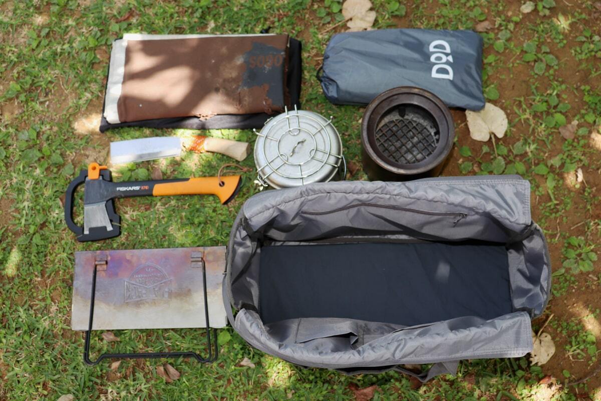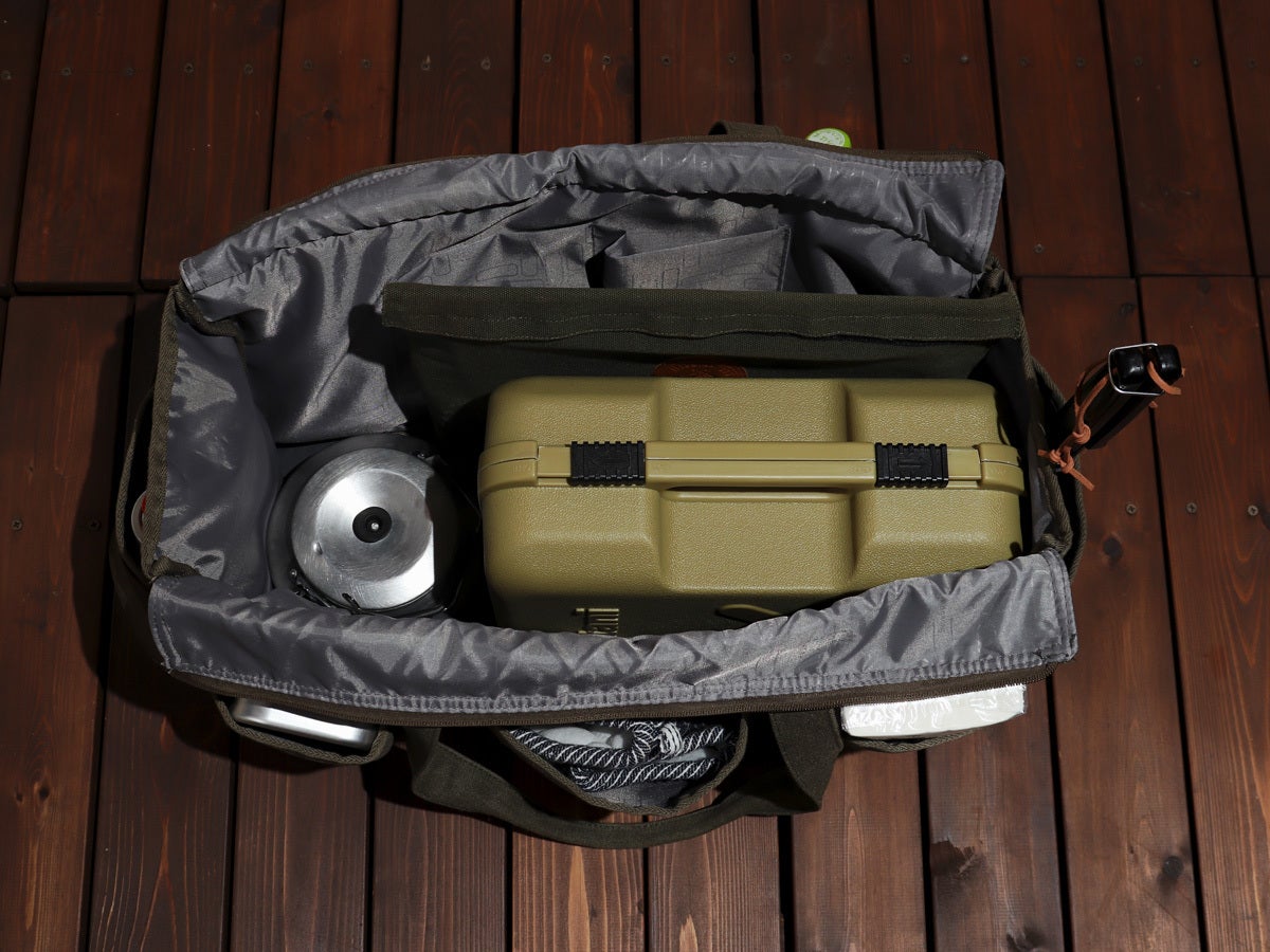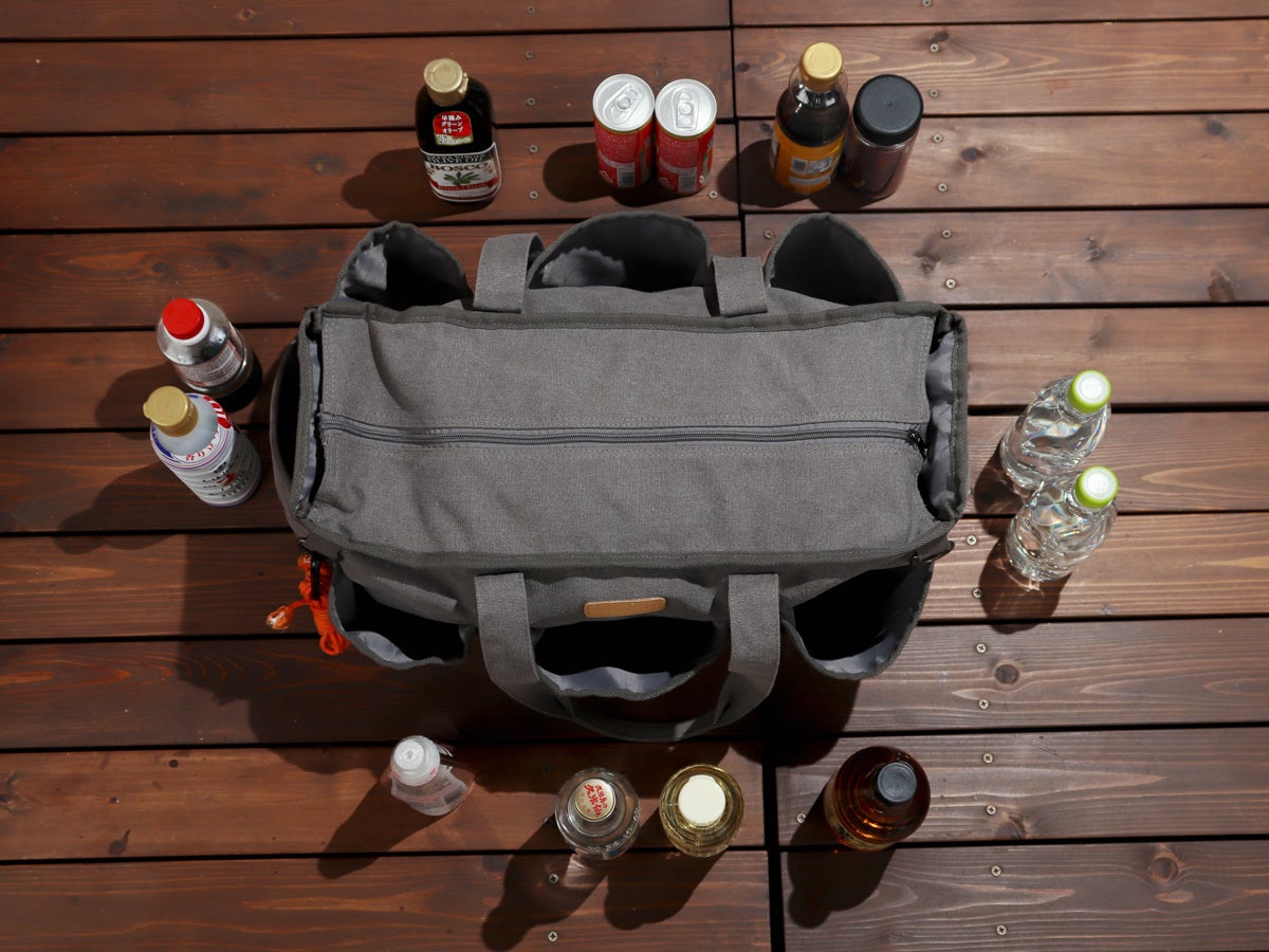ただ収納力があるだけでなく、ガス缶や保温ボトル、シェラカップや焚火道具など持運びしにくい形状の道具をまとめて収納できるバッグなんです。