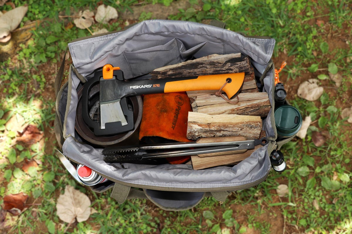 トングや火バサミ、斧やハンマーなど長めの道具はサイドポケットに入れて快適に持ち運べます。