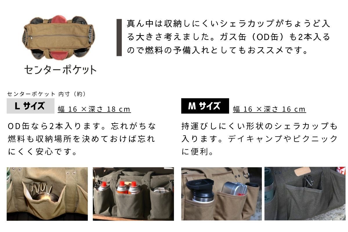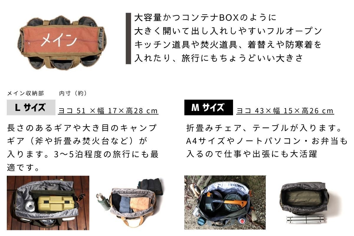 Lサイズ の横幅(約)52cm これはカセットコンロや焚火台、斧など大きいギアも収納できるサイズに設計してあります。 (写真:L size)