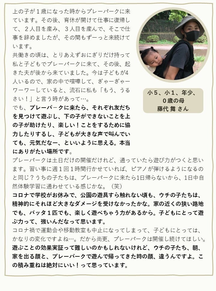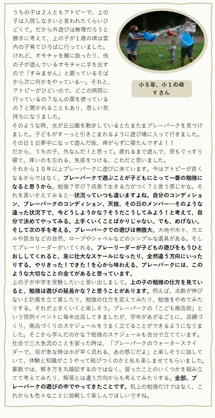 どうか、子どもたちがのびのびとあそび、豊かな体験を積み重ねていく『光が丘プレーパーク』を続けていくために、どうか最後まで、ご支援・ご協力いただけますと幸いです。