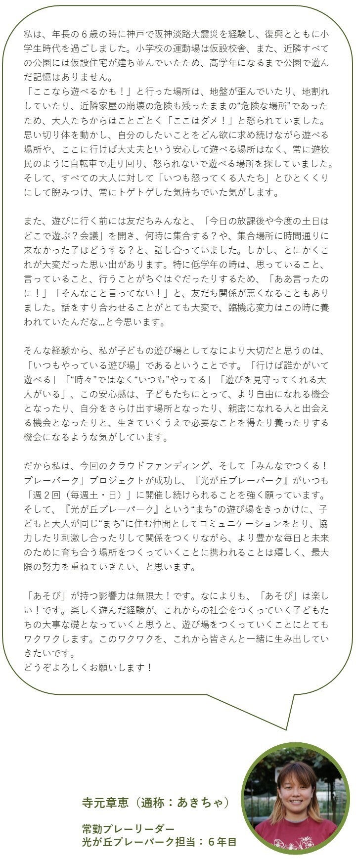 (6)常勤プレーリーダー「あきちゃ」からのメッセージ
