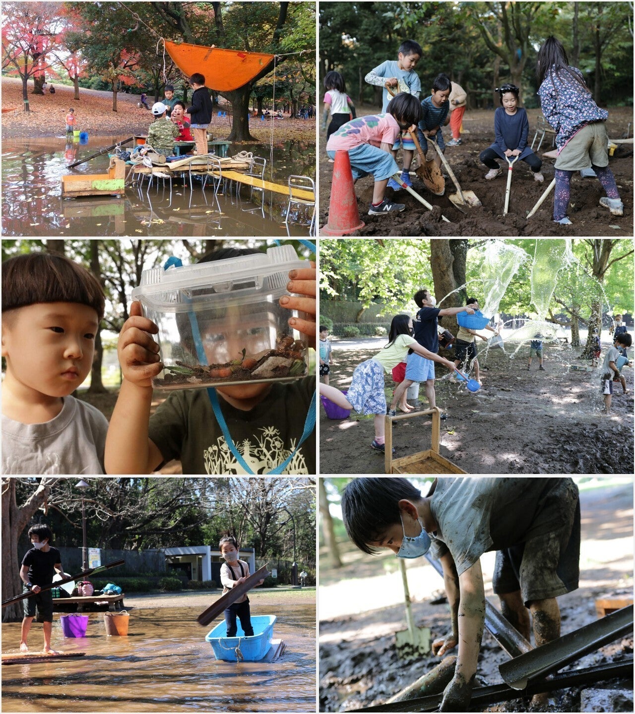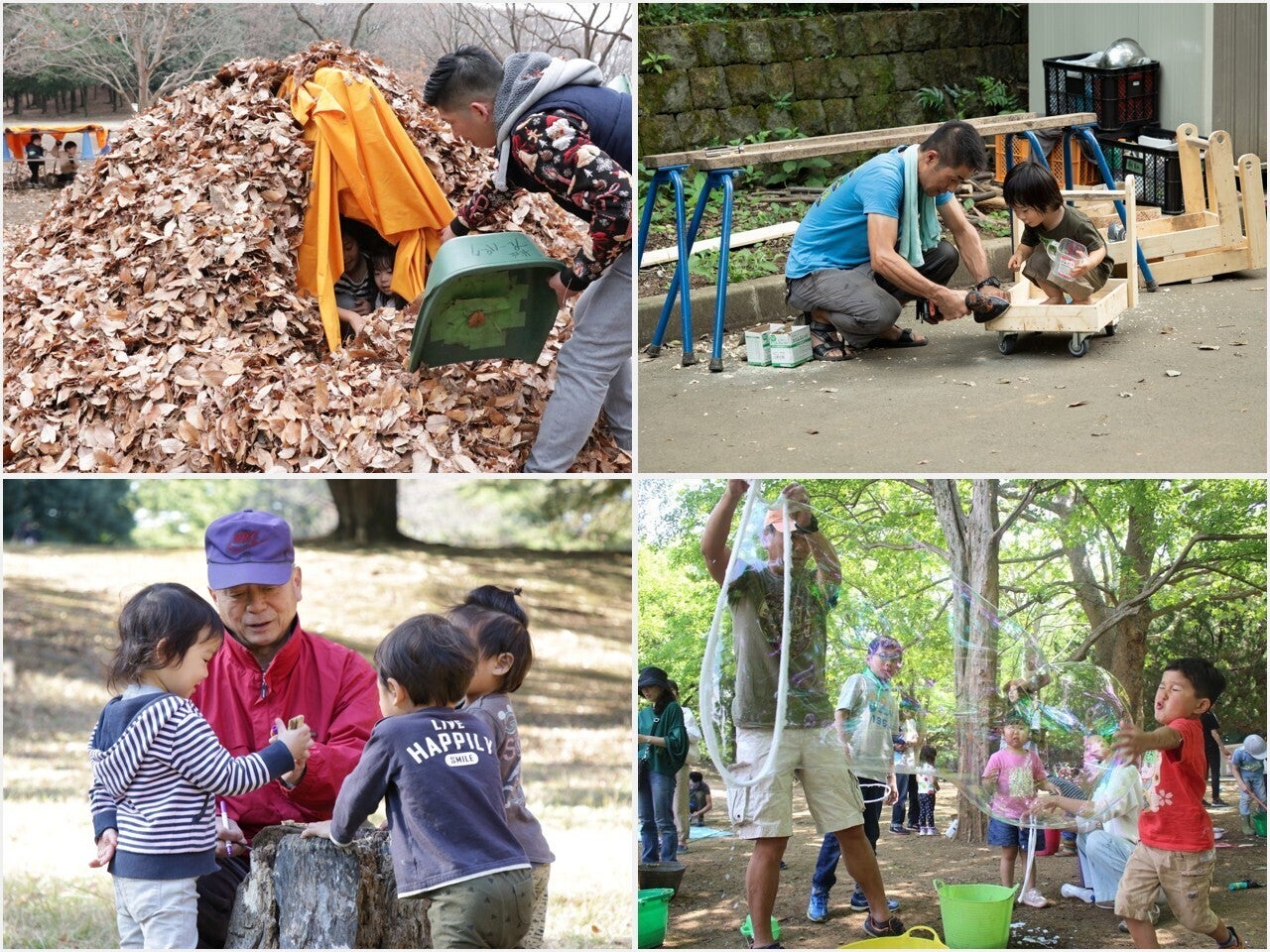 プレーパークでは、自由に使える道具類(バケツ、スコップ、ロープ、布、木工工作道具等)を揃え、土や水、木、葉っぱ、どんぐり等身近にある自然素材も使って遊んでいます。例えば泥んこ遊びや穴掘り、木登り、落ち葉集め、坂道滑り、水遊び、葉や実を使ったクラフト工作、木工作、虫や生きもの探しです。