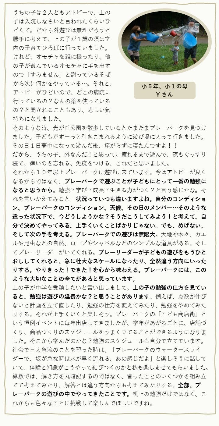 みんなで作るプレーパークだから、みんなで守りたいな。いつもやってて気軽に誰でも参加できるのがいいよね。 たまにしか行けないけど、学校じゃ教えてくれないこと教えてもらってるよ!子どもの遊びに真剣な目、楽しかったーって報告、次はあれしようとか誰と遊ぼうとか。そんな姿が見れて私も嬉しい!応援してます!一緒に頑張ろうね!また遊ぼうね!