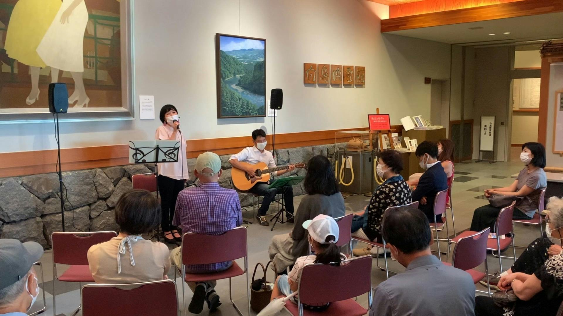 小諸市高原美術館にて開催中の海野和男写真展「昆虫の擬態・バタフライガーデン」では、生きもの写真リトルリーグの過去受賞作品展が併設されています。去る7月22日のオープニングイベントでは「真辺雄一郎&今泉由香 ミニコンサート」が催されて、生きもの写真リトルリーグテーマソング「さぁ!カメラを持って!」もライブ演奏されました。