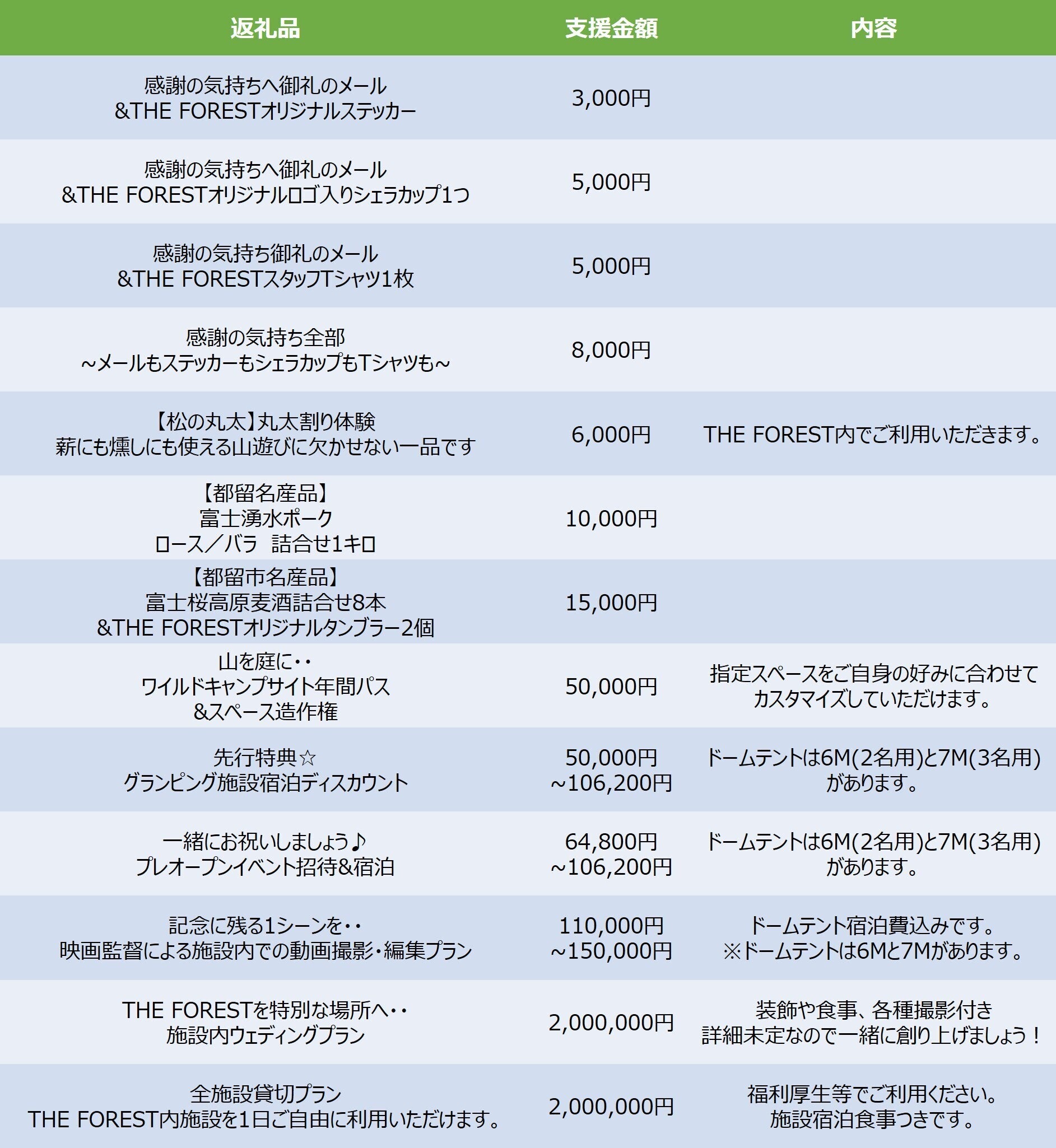 リターンは、ベーシックな宿泊ディスカウントはもちろん、特別感あふれるものを用意したつもりです。
