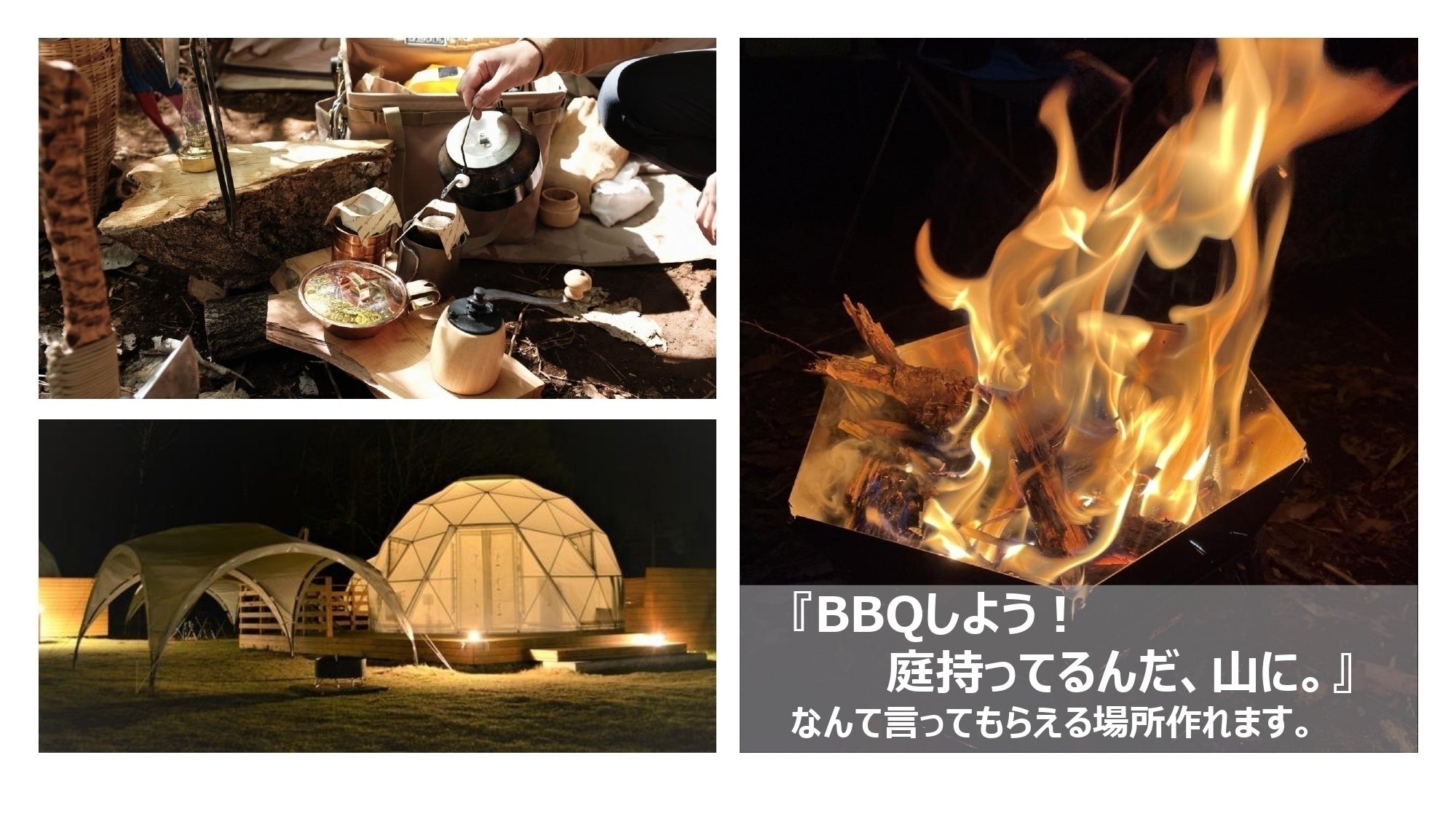 コンセプトは【グランピング+ワーケーション=森で愉しむ】としており、グランピング施設だけでなくワイルドキャンプエリア、コワーキングスペースも設置します。