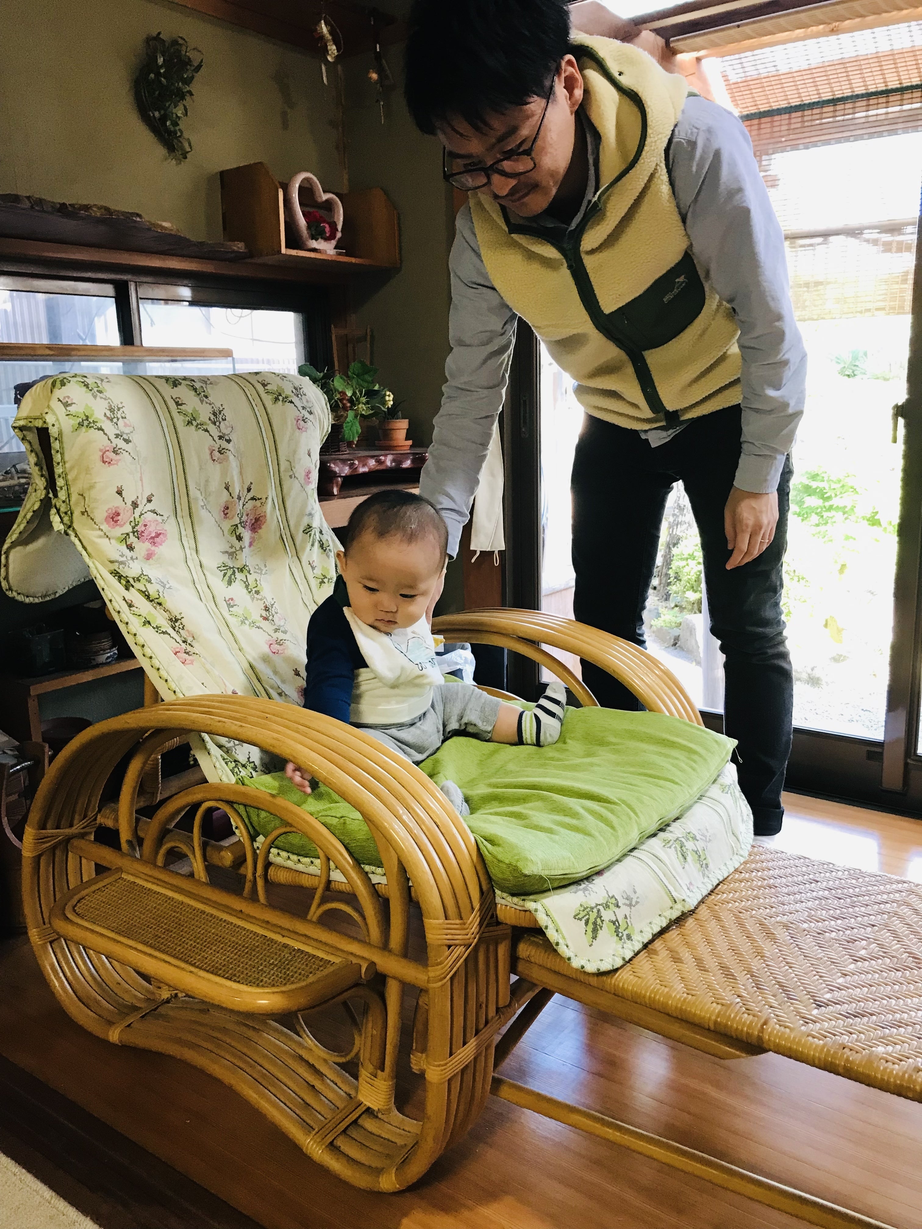爺ちゃんがいつも座っていた椅子に座る息子