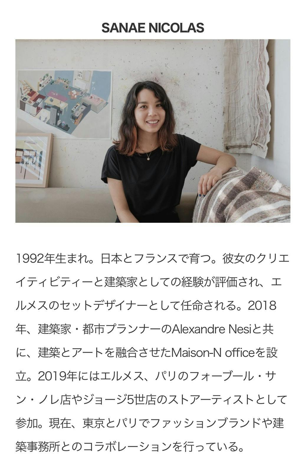 SANAE NICOLAS:クリエイティビティーと建築家としての経験が評価され、エルメスのセットデザイナーとして任命される。現在は東京とパリでファッションブランドや建築事務所とのコラボレーションを行っている。