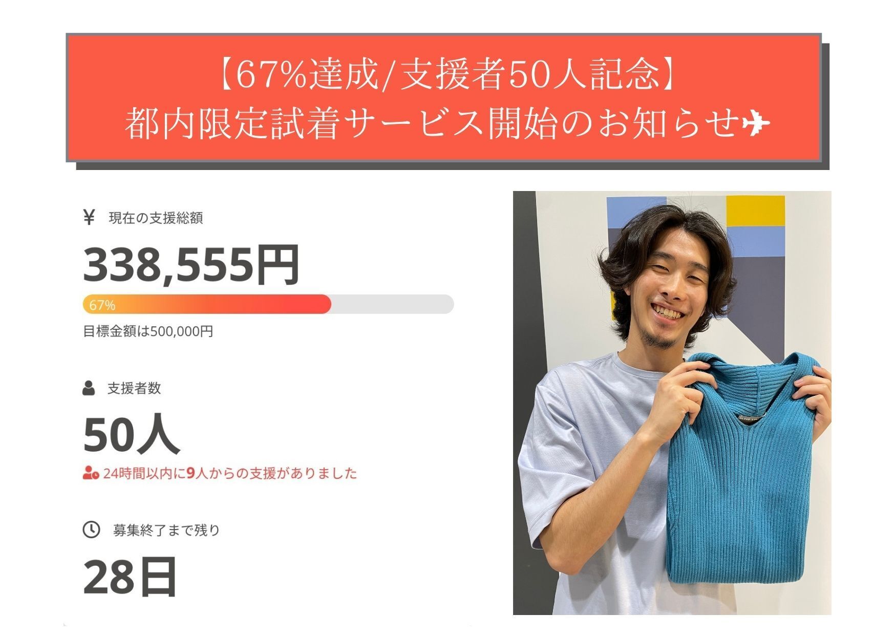 皆様のお陰でプロジェクト開始後、6日間で目標金額の100%である50万円を達成することができました!77人もの方にご支援頂き、非常に多くの方々から応援のコメントも頂いております。 国内産地を継承していく一歩目のアプローチとなる、服の裏側を開示する取材活動に踏み出すことができるため、非常に力を頂き、心からの感謝と同時にこれから先のファッションのあり方に挑戦していく覚悟を固めております。 この度、stitch_とCLOUD LOBBYのプロジェクトでは、ネクストゴールとして新たな目標を設定させていただきました。これから先の日本におけるファッションのあり方を作り、国内産地を継承していく上で、二つ目のアプローチである、職人の技術を継承していく未来のクリエイター育成の仕組み作りに向けての一歩を踏み出していくために、ネクストゴールとして目標金額150万円を設定します! ネクストゴールを達成することができた場合、以下の2点の実現に向けた一歩を踏み出すことができます! ①こだわりと個性を追求した服作りを身近にするマッチングプラットフォームの開発 →世界から評価されている国内産地の生地や縫製技術を持つ職人さんと、若手クリエイターや個人を直接繋ぐマッチングプラットフォームを開発し、個性やこだわりの追求を身近にしていきます。 ②国内産地の技術を継承する未来のクリエイターで全国を回るポップアップ展示会 →日本のものづくり職人と未来のクリエイターを繋げ、個性やこだわりの追求を身近にしていくポップアップ展示会を全国で開催していきます。 3ヶ月後の11月には、1度目のポップアップ展示会を開催し、国内の職人の技術を継承していく若手クリエイターを集めて、服作りの裏側にある作り手の方々によるストーリーを皆様に楽しんでいただく場とさせていただきます。 服作りの透明性を高めることで日本の技術とその魅力を感じていただくために、私達stitch_が、裏側の作り手のストーリーを純度高く伝えていくことに全力を尽くさせていただきます。 引き続き、これからの日本のあり方を見て日本のものづくりを次の世代に引き継ぎ、服の領域で日本を盛り上げていく覚悟で挑んで参りますので、どうか応援、ご支援のほどよろしくお願い致します! stitch_ 平澤 CLOUD LOBBY 大浦