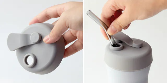 フタを交換すると、持ち歩き用ボトルになります。ストローを使用可能で、外出先でも飲みやすい形状です。こちらは、耐熱性シリコン製となります。