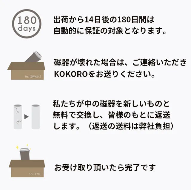 出荷日から自動的にご支援者の皆さまに適用されます。商品到着後180日以内に破損した場合、一度のみ内側の磁器を交換致します。
