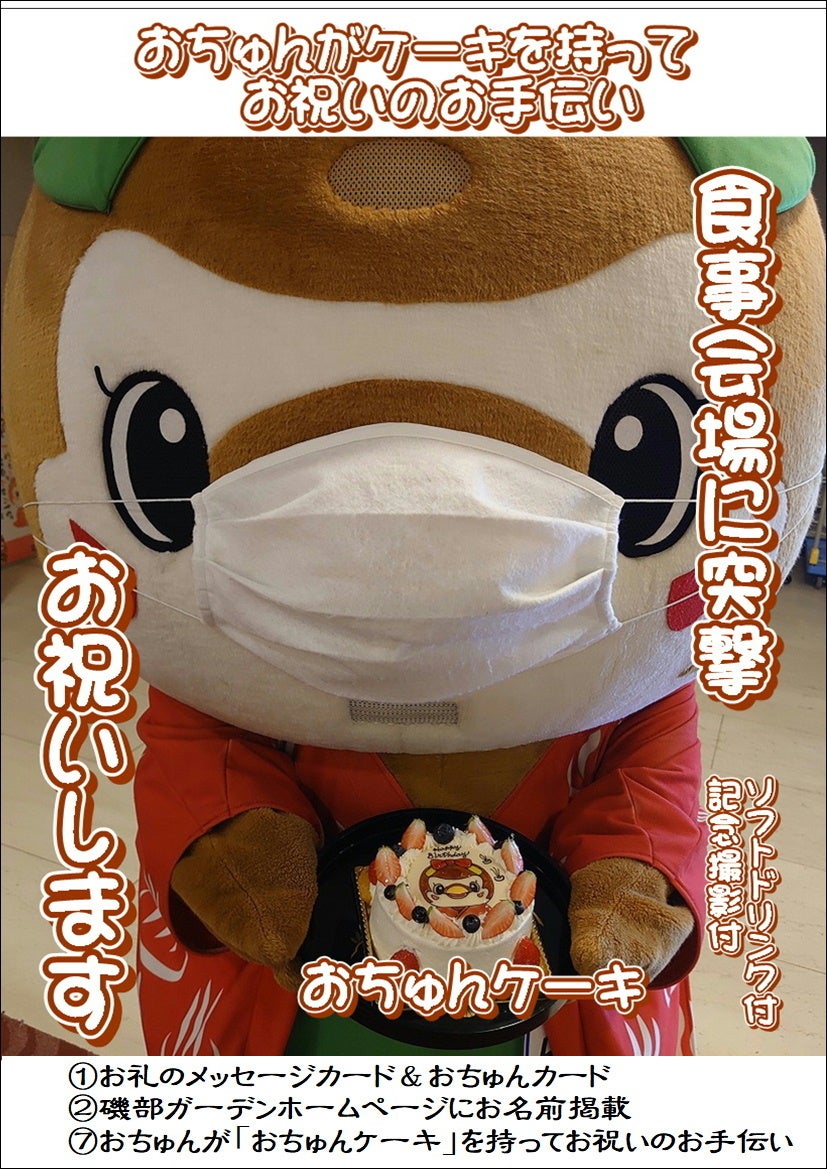 ⑦ おちゅんが「おちゅんケーキ」を持ってお祝いのお手伝い