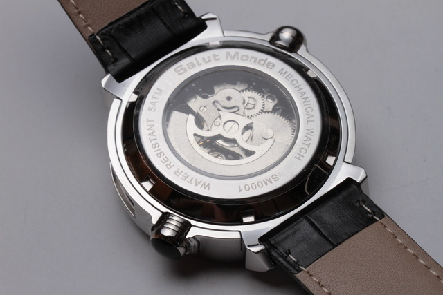 表・裏共にスケルトンのエキシビジョン・ディスプレイ。時計機構のメカニカルな美しさを堪能できます。