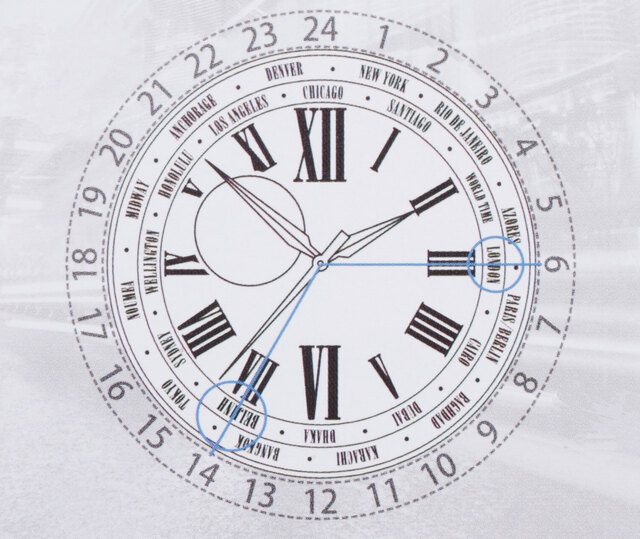 ※例えば、あなたがもし北京にいて午後2時(24時間表示で14時)の場合、ダイアルのBEIJINを14まで回転させます。すると例えばロンドンはA.M.6時であることがわかります。