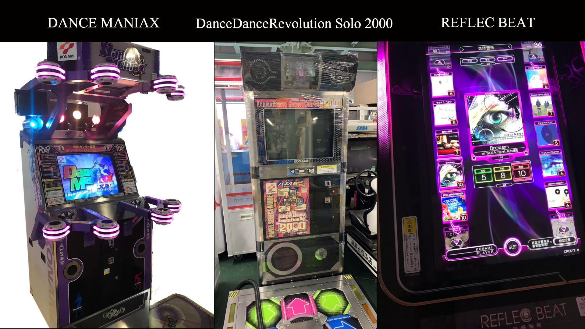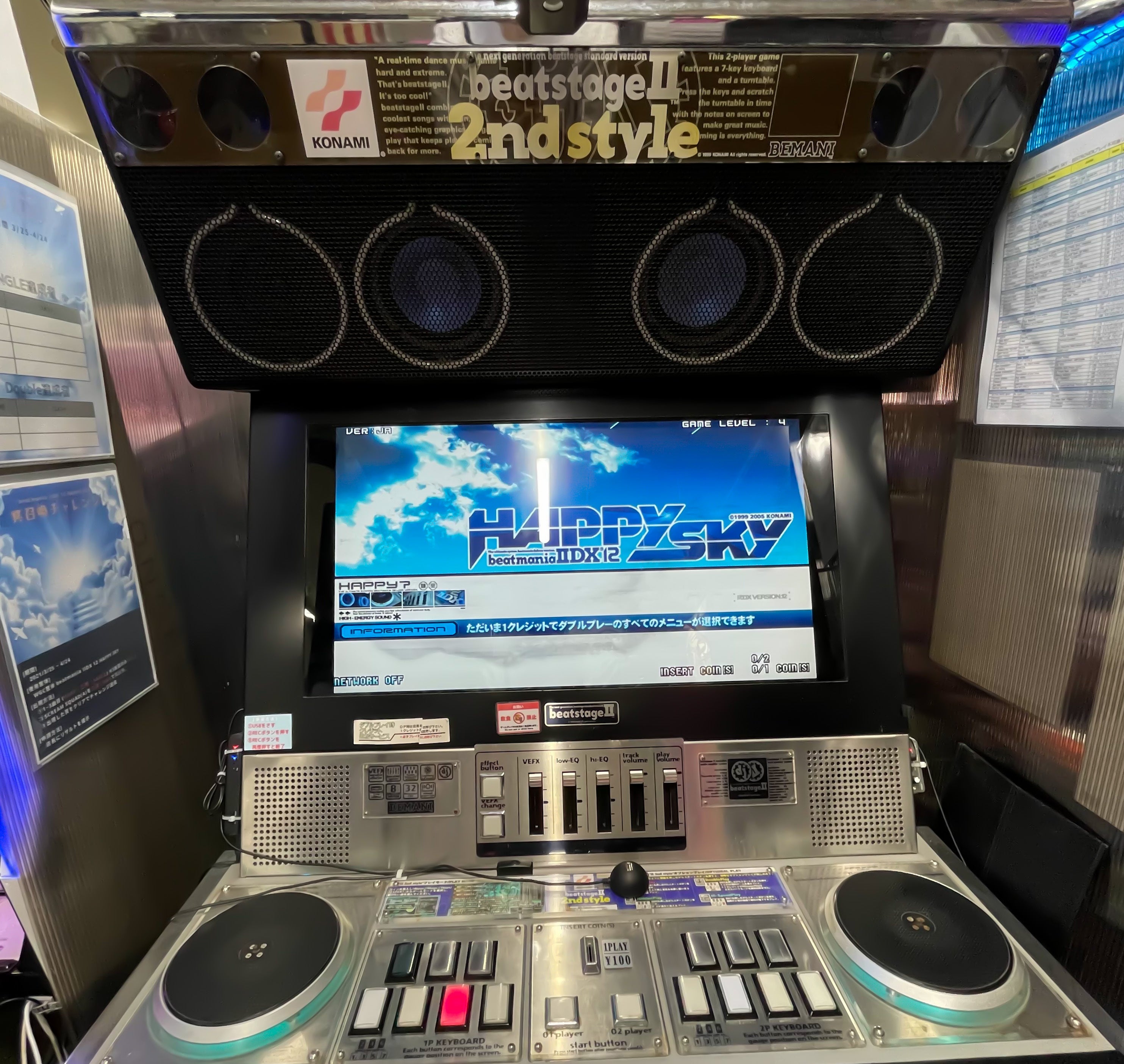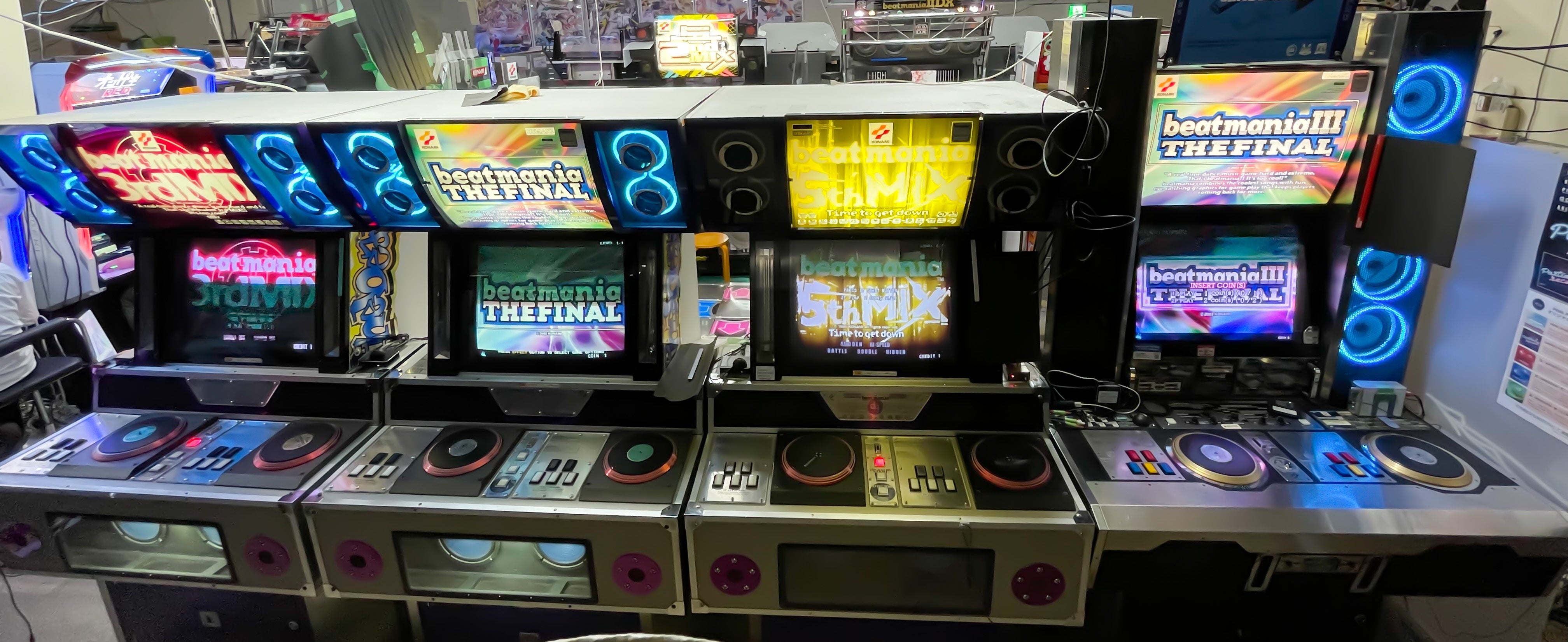 1998年に発売した音ゲーの原点beatmania。5鍵盤3台、そして後期に発売された上位シリーズbeatmaniaⅢ筐体。