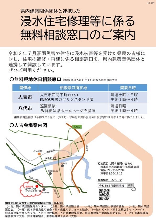 熊本県建築士会人吉支部では、熊本県建築課や人吉球磨設計事務所協会などと連携して、毎週土曜日と日曜日に令和2年7月豪雨災害で浸水被害を受けた住宅の補修・再建に係る相談窓口を開設しています。