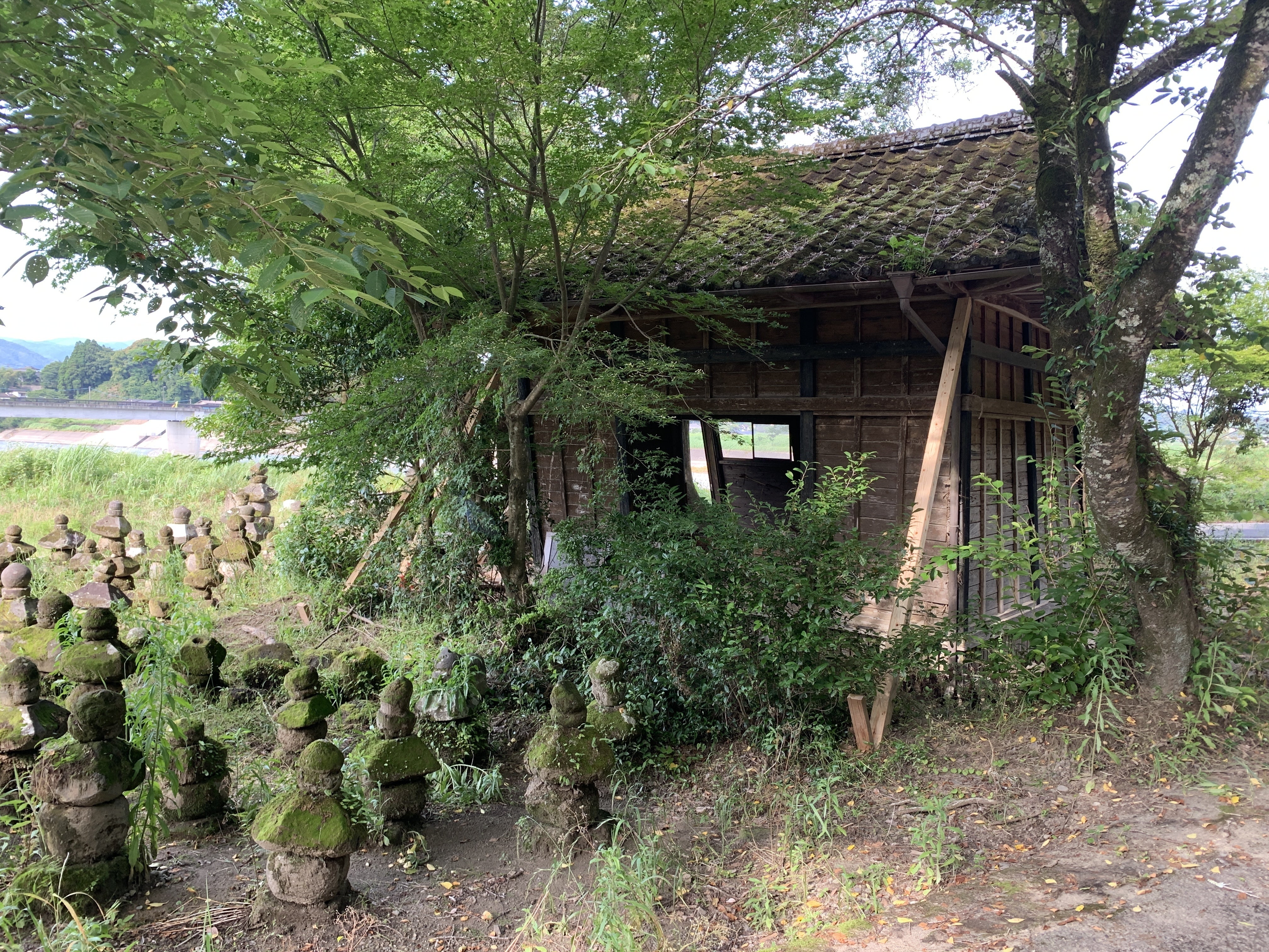 お堂は球磨川の流れに沿って北西側に大きく傾いているので、北側と西側に角材を立てて突っ張っています。