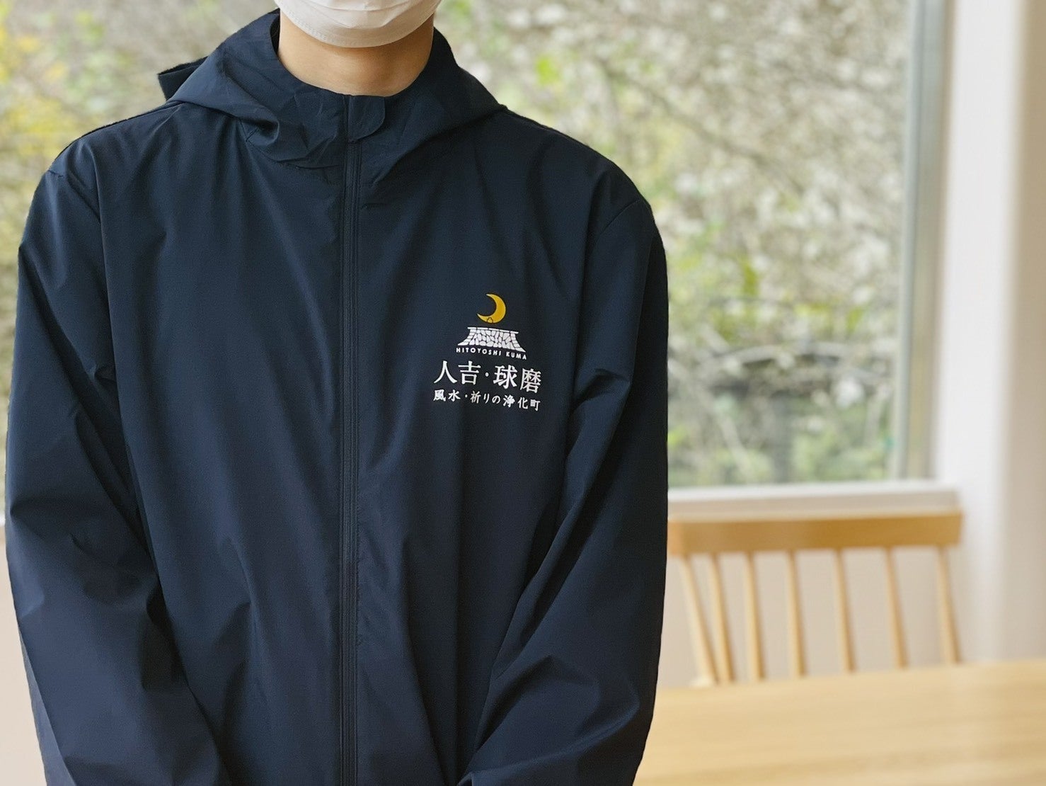 13,000円のリターンとして、竣工写真付きのお礼メッセージに加えて、「人吉・球磨 風水・祈りの浄化町」のオフィシャルチャリティーウインドブレーカー(Lサイズ)を提供します。限定5着。