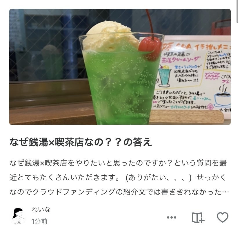 本日は、喫茶スタッフれいなによる銭湯×喫茶店についての記事をご紹介。