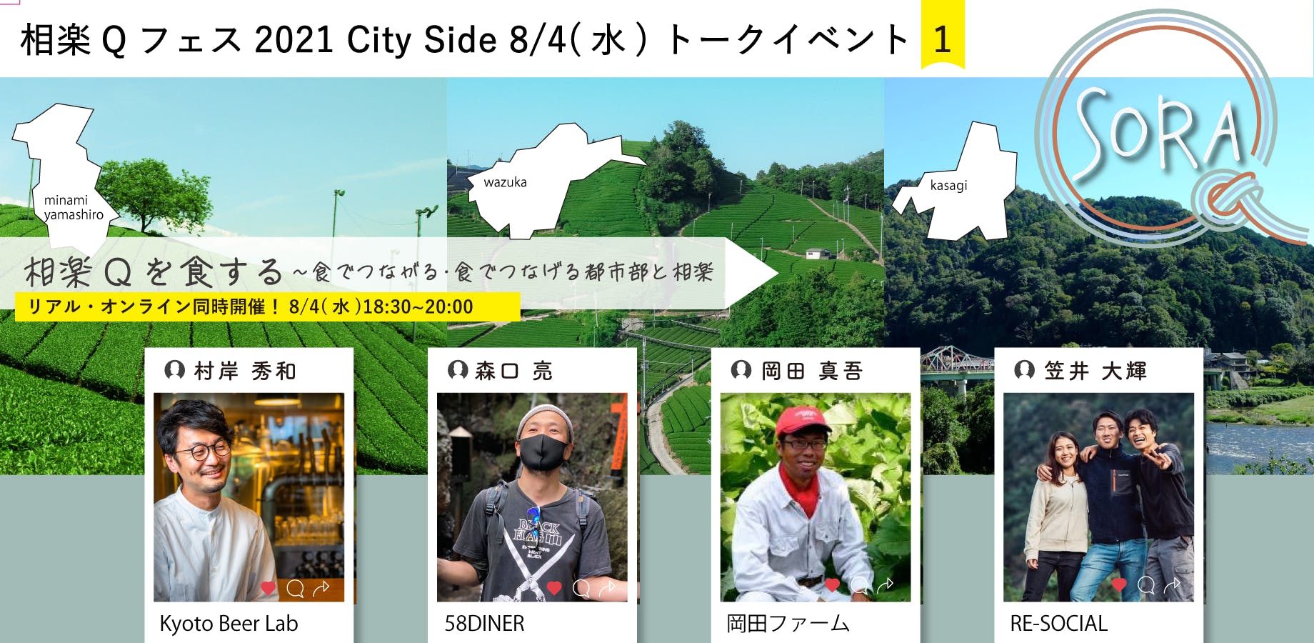 京都市内の食のプロたちが、相楽Qの食について、都市部の飲食店の立場として、生産者として、それぞれの思いやこれからついて、お話を伺います。