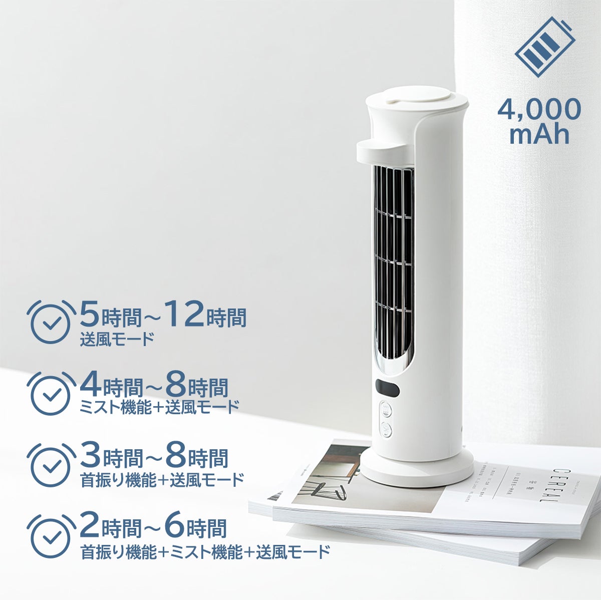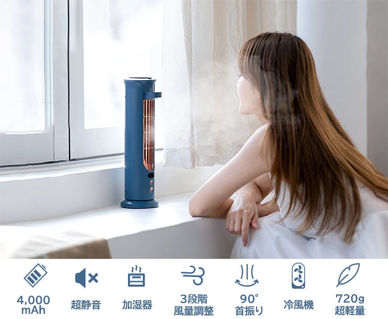 冷風扇「iLair」は4,000mAhのバッテリーが内蔵され、風量モード弱では最大12時間、ミスト+風量モード弱では最大8時間稼働できます。もちろん、電源に繋ぎながらも使用可能です!