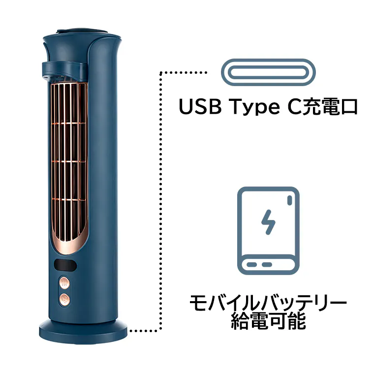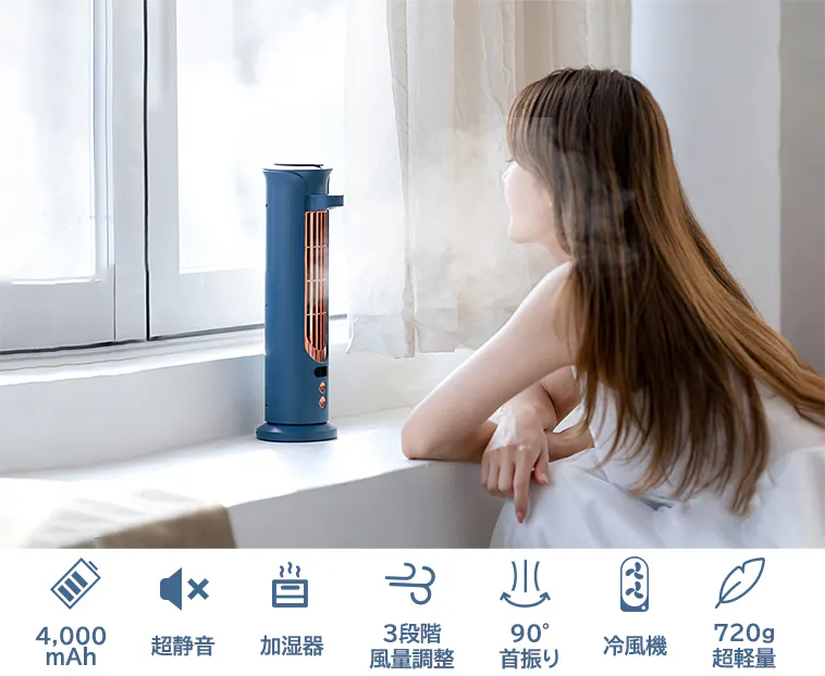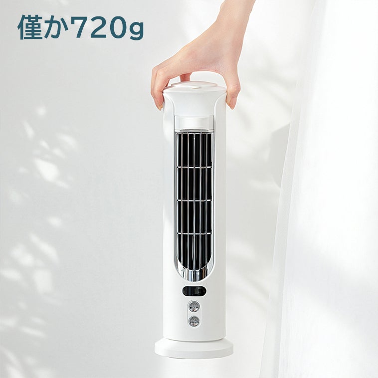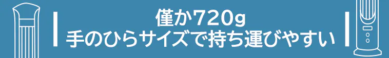本体は僅か720gの超軽量ボディー。従来型のタワー扇風機よりコンパクトで、持ち運びやすいです。