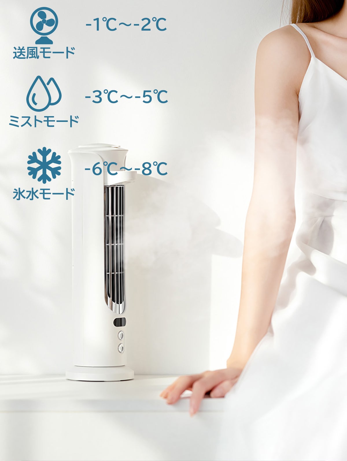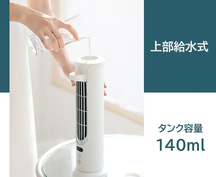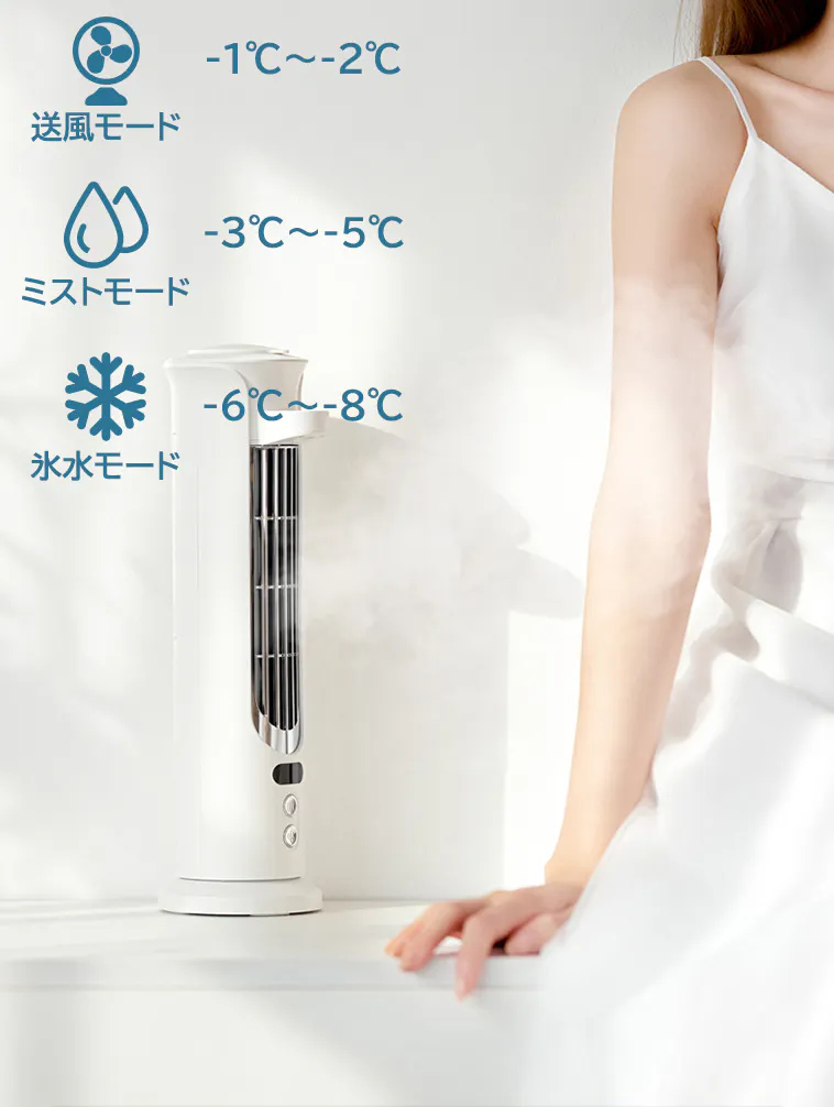 超音波でミスト化された水が急速に蒸発し、風と周囲の熱を下げ、涼しい風を届けます。