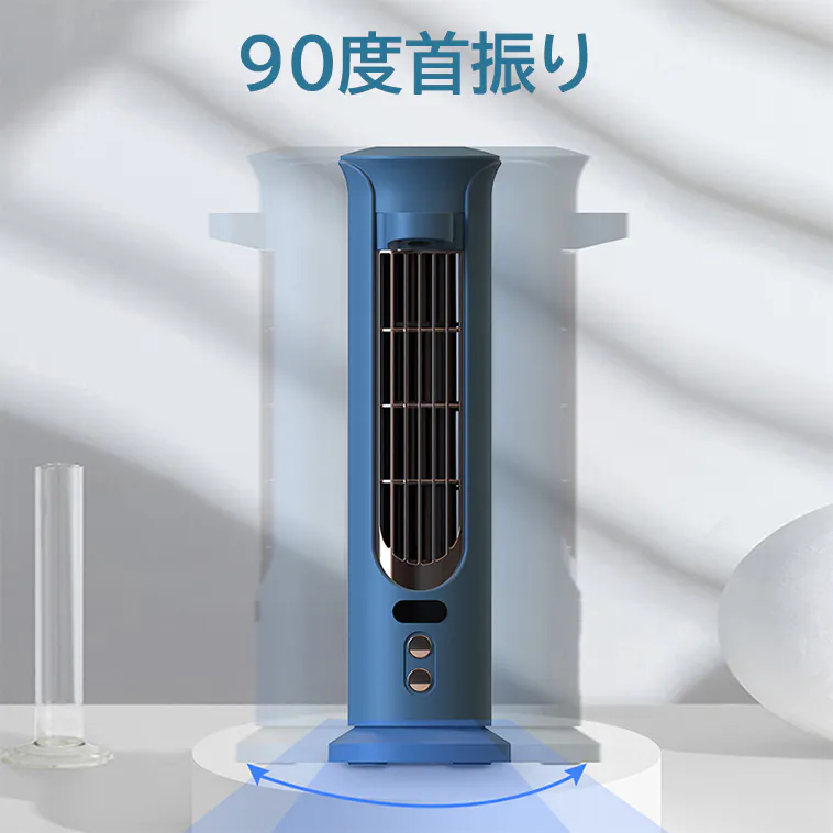 首振り機能を搭載しているため、左右に45度、広範囲に送風することを実現。ふつうの扇風機では左右に振る際に、障害物があるとぶつかりますが、タワー扇風機はボディが円筒形で、左右に首を振ってもぶつかることはないので、卓上に置くに最適。