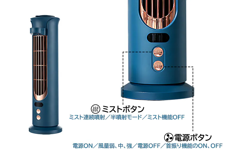 ※電源ボタン:電源ON/風量弱、中、強/電源OFF/首振り機能のON、OFF(長押し)