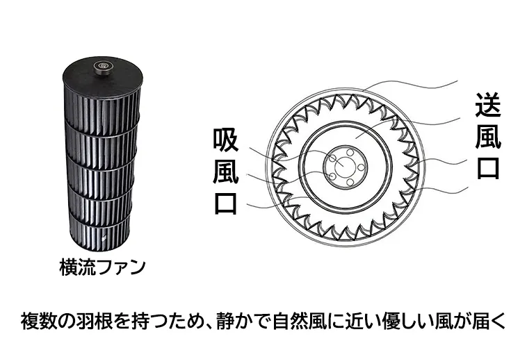 横流ファンという円筒形のプロペラを内部で回して送風する構造で、最も自然風に近く、優しい風を実現。