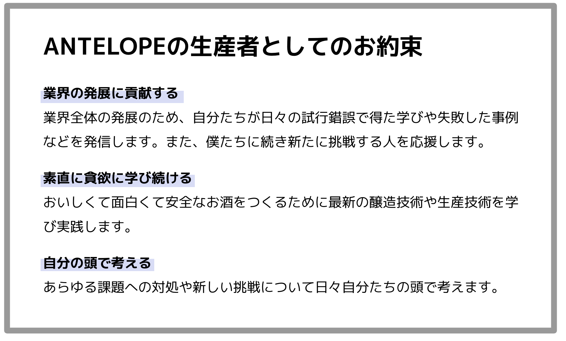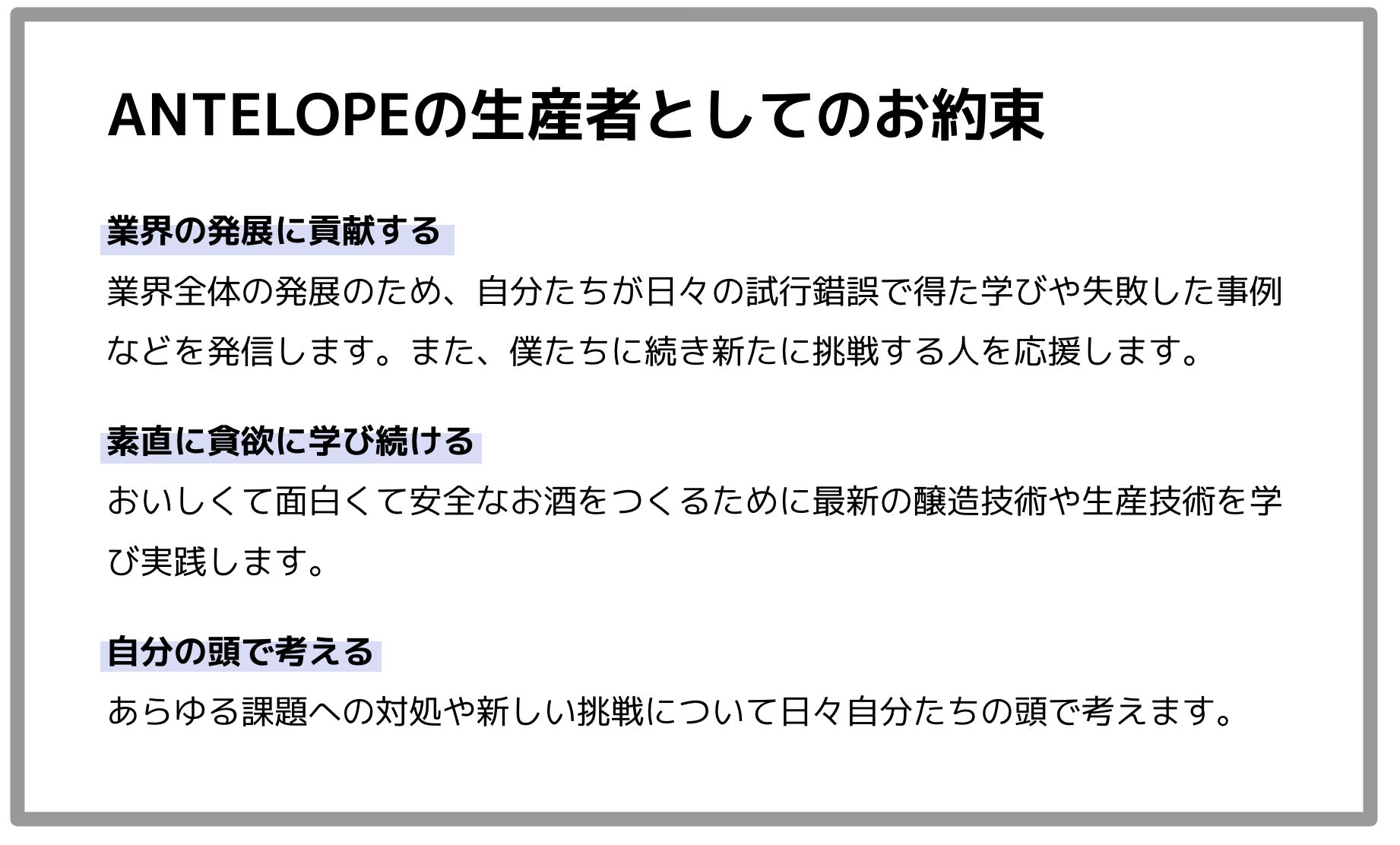これからもANTELOPEや個人の発信を通じて、美味しいお酒の作り方や、工場を設立するまでの奮闘記などを発信することで、僕たちとともに美味しいお酒を追求し、楽しいお酒の場を醸していく文化を一緒に作る仲間のためになればと思っています。