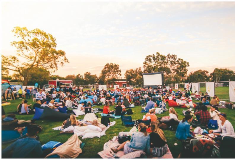 夕暮れの野外でお酒と映画を友達や家族と楽しむイベント