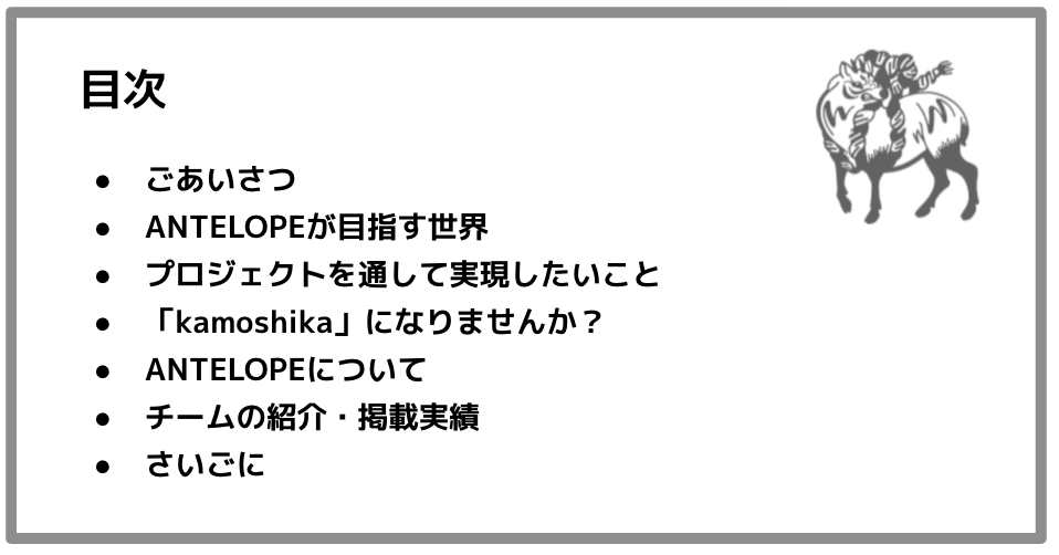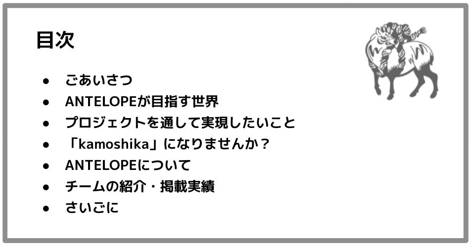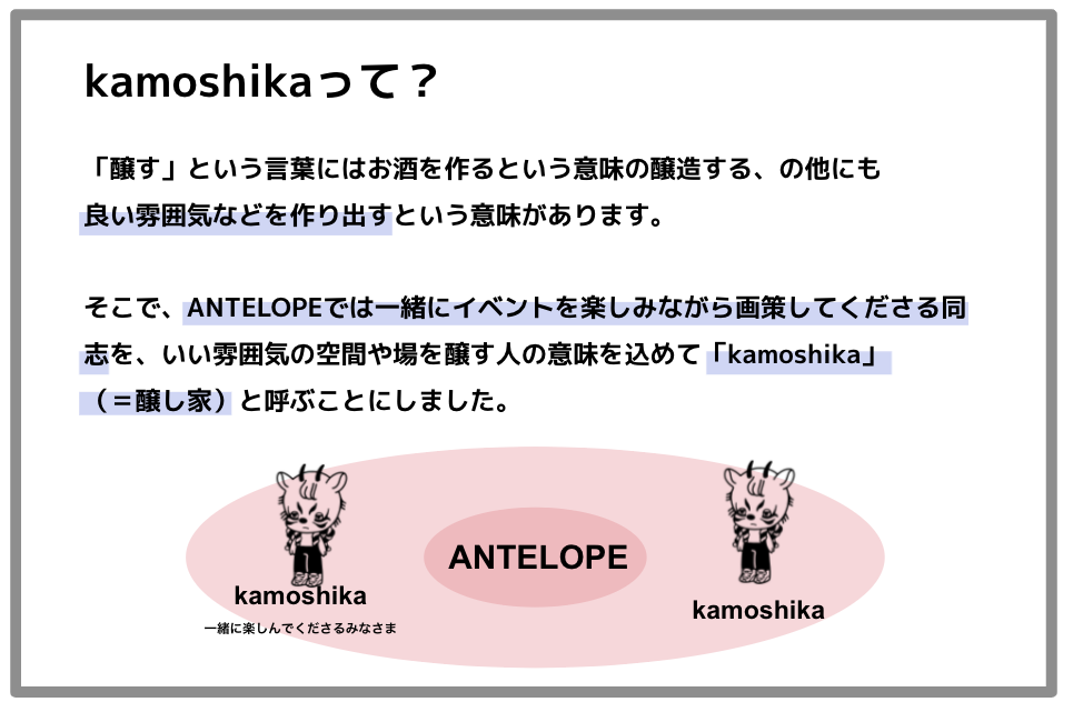 kamoshikaとは、ANTELOPEと一緒にイベントを楽しみながら画策してくれる方々を指します。kamoshikaになるには、今回のプロジェクトに支援するだけです!