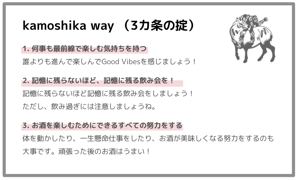 お酒の空間をうまく醸す「kamoshika」であるためにも、この3つは常に心に留めましょう。逆にこの3つにあてはまるなら、もうあなたはkamoshikaです。