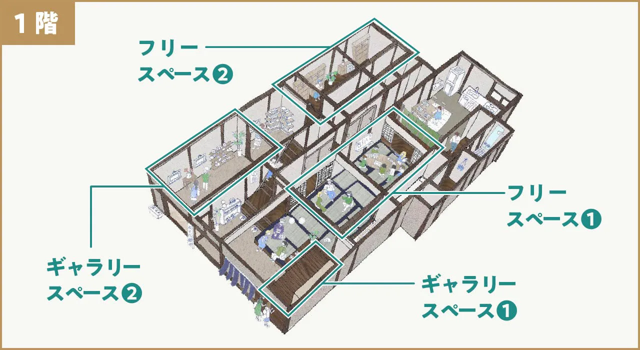 「松千代館」再生後のイメージ1階でお貸出できるのは、ギャラリースペースとフリースペースです。