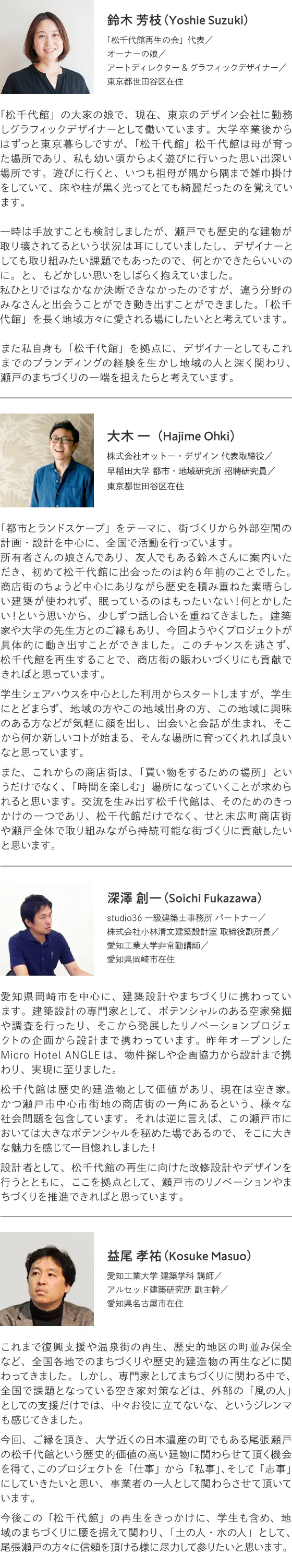 メンバーは、「松千代館」オーナーの娘でありグラフィックデザイナーの鈴木 芳枝を代表として、様々な立ち位置でまちづくりに携わる大木 一、深澤 創一、益尾 孝祐の4名です。