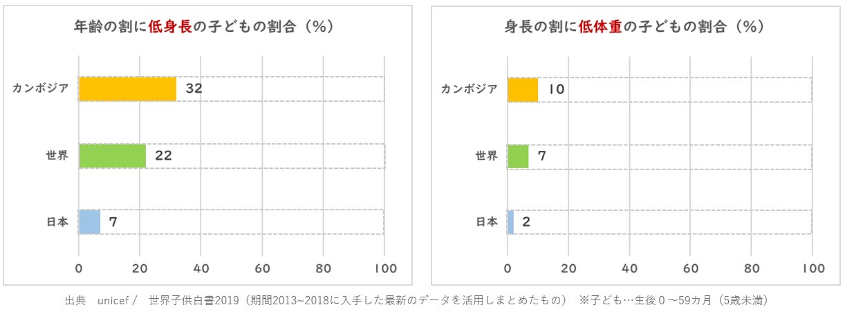なお、グラフ上の数値はすべて5歳未満児のデータですが、カンボジアの学齢期の子どもの低身長は33%、低体重(10歳以下)は15%となっており、学齢期の子どもたちの多くも同様に低栄養状態にあることがわかります。