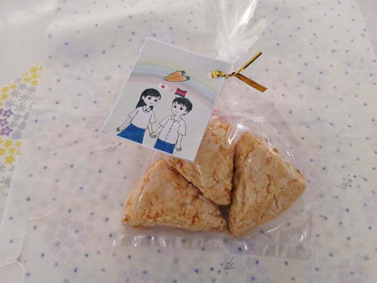 また、絵本で野菜の大切さを伝えていることを踏まえ、一緒に配るお菓子にも、野菜を使うことを決めました。カンボジアと日本の双方で試作し、メンバー間で意見を交わしながら、人参をつかった米粉のスコーンのレシピを完成させました。人参を活かした食欲をそそる明るい色の、ほんのり甘いおやつになりました。