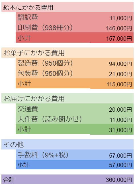 2021/09/26 11:24みなさま、こんにちは。当プロジェクトでは、皆様のおかげで、目標金額を上回る439,500円のご支援をいただきました。これにより、プロジェクトの予算と配布先についての最新情報を、ご報告させていただきます。まず、新たに12の学校や病院などに、絵本を配布することが決定しました!!また、20冊を予備として追加で印刷し、NOM POPOKにて保管し、今後の活動の必要に応じて、新たに配布して参ります。本プロジェクトでの絵本の総印刷数は合計1007冊となります。次に、予算です。大きな変更点は、以下のとおりです。1. 翻訳の質を高めるため、外部翻訳者を2名に増やしました。2. 絵本印刷数の増加による増額。また、印刷数が増えたことで、印刷単価が下がったため、より質の良い絵本を届けられるよう、全てハードカバーで印刷することを決めました。3. 配布先の増加により、配布にかかる交通費、送料、人件費が増額しました。4. 直接の配布を諦めていた地方の学校・病院2件に直接訪問するための交通費を加えました。5. 配布の様子などを収めたビデオの作成を、外部委託することとしました。皆様の温かい応援とご理解のおかげで、活動幅を広げることができそうです。これを機に、初めて連絡させていただいたNGOに歓迎していただいたり、久しぶりに連絡した方には「食育絵本のことを噂で聞いていて、読んでみたいと思っていた」と言っていただけたりして、大変嬉しく、また一層身の引き締まる思いでおります。今後の進捗も、楽しみにお待ちいただけましたら幸いです。 もっと見る