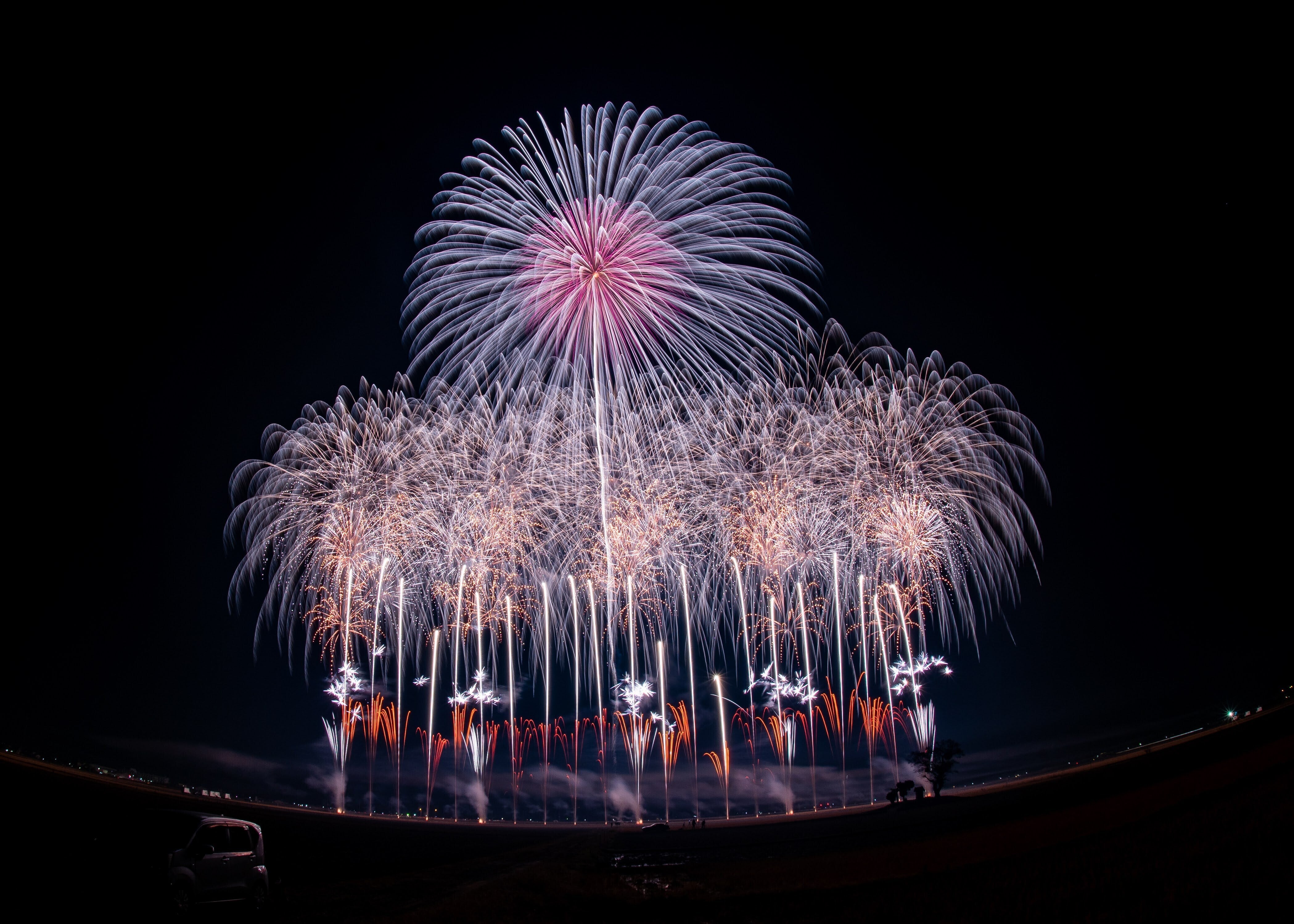 「800mワイドのプロローグ花火」に始まり、「400mワイドスターマイン」、