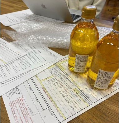 取れたひまわりオイルは検査機関、日本食品分析センターに提出して、化粧品に使えるか調べていただきました。合格をいただきました。その後、無償でサンプル試作をお手伝いしてくださる化粧品工場の方からは「きれいな油ですね」とお褒めの言葉をいただきました!